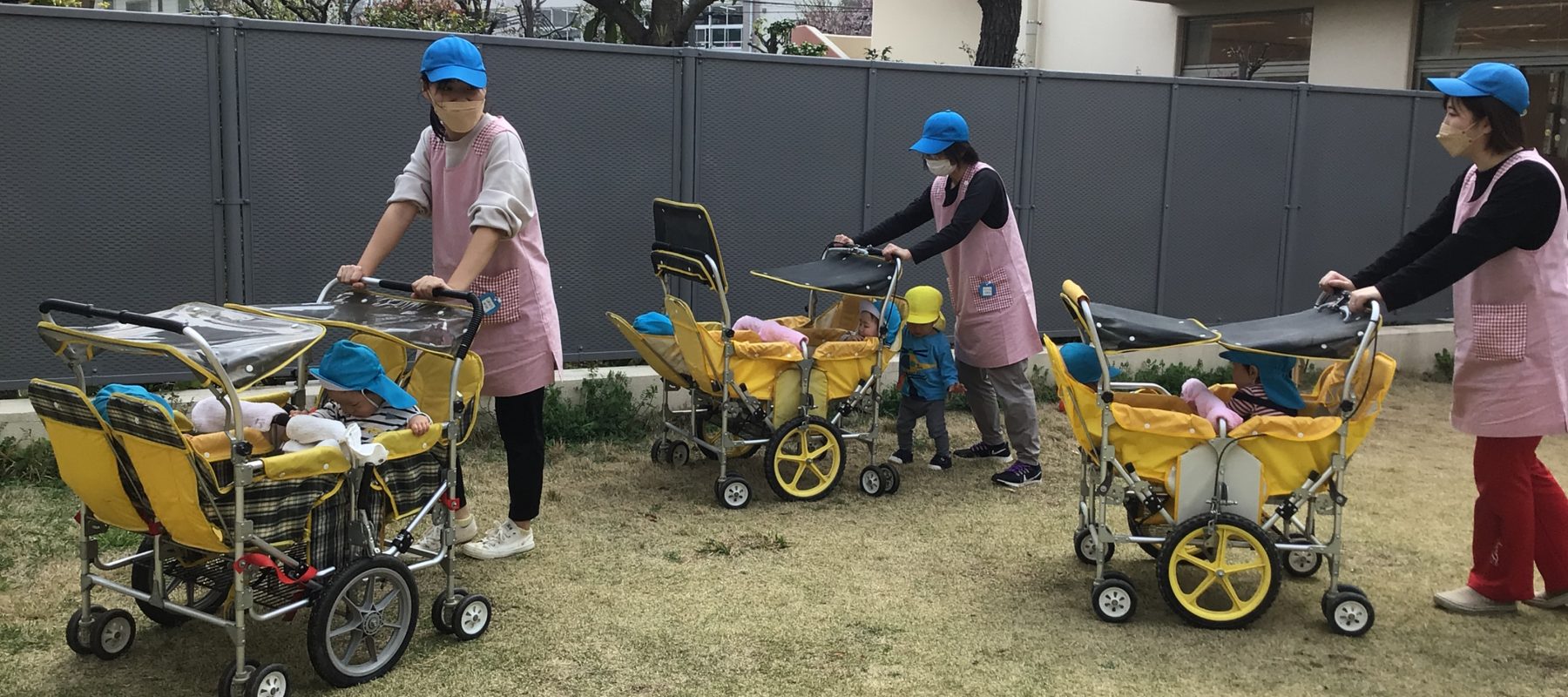 今日はバギーに乗って、乳児園庭をお散歩しましたよ。日差しも気持ちよく、ポカポカ陽気に誘われてウトウトしている子や、一緒に遊んでいたいちご組のお友達を興味津々で見ている子もいました。