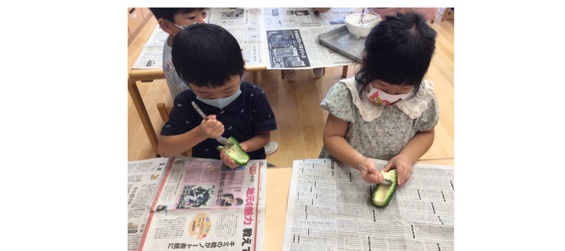 「ボコボコしてる!」「いいにおいがする。」「苦いのかな?」と、ゴーヤの手触りや匂いを嗅いで楽しむ子ども達。そのゴーヤを使っておやつには“ゴーヤの変わり揚げ”が出ました。