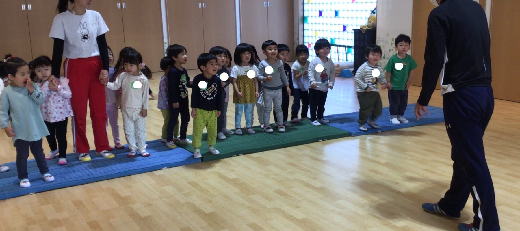 3歳児クラス、りんご組さんは初めての体育指導がありました。始まる前から「どんなことをするんだろう?」「何先生かな?」とドキドキワクワクしていたお友達!講師の先生のお話をよく聞いて、よく見て楽しそうに体操やゲームに参加していましたよ。これからの体育指導も楽しみです♪