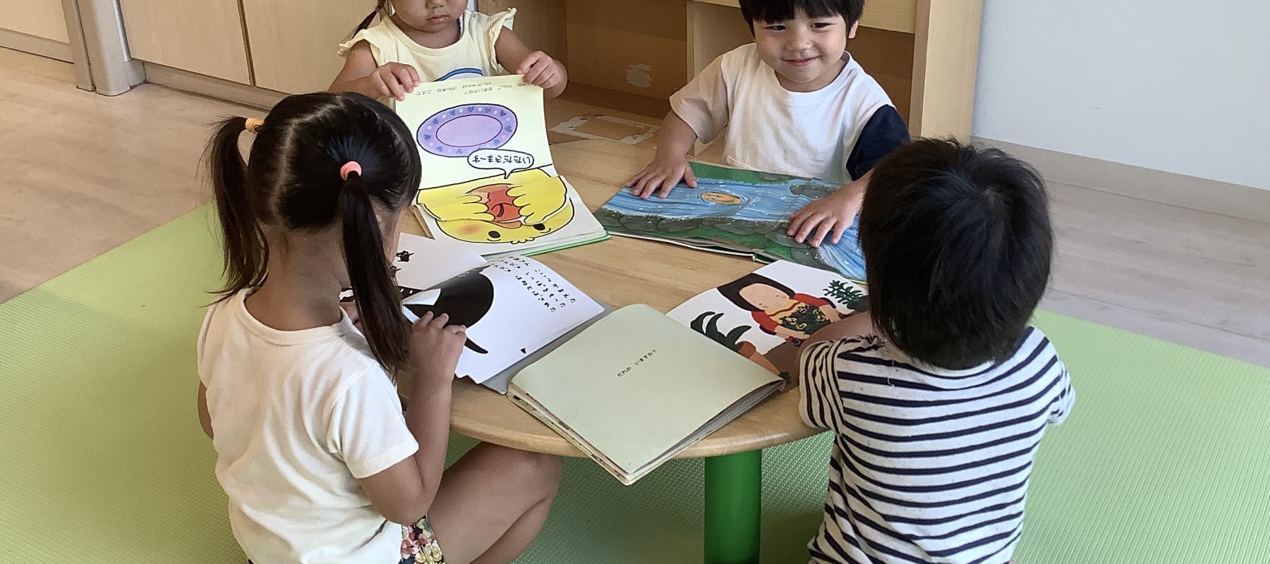 好きな絵本を選んで1人でじっくり読んだり、お友達や先生とお話しながら同じ物語の世界を楽しんだりしています。