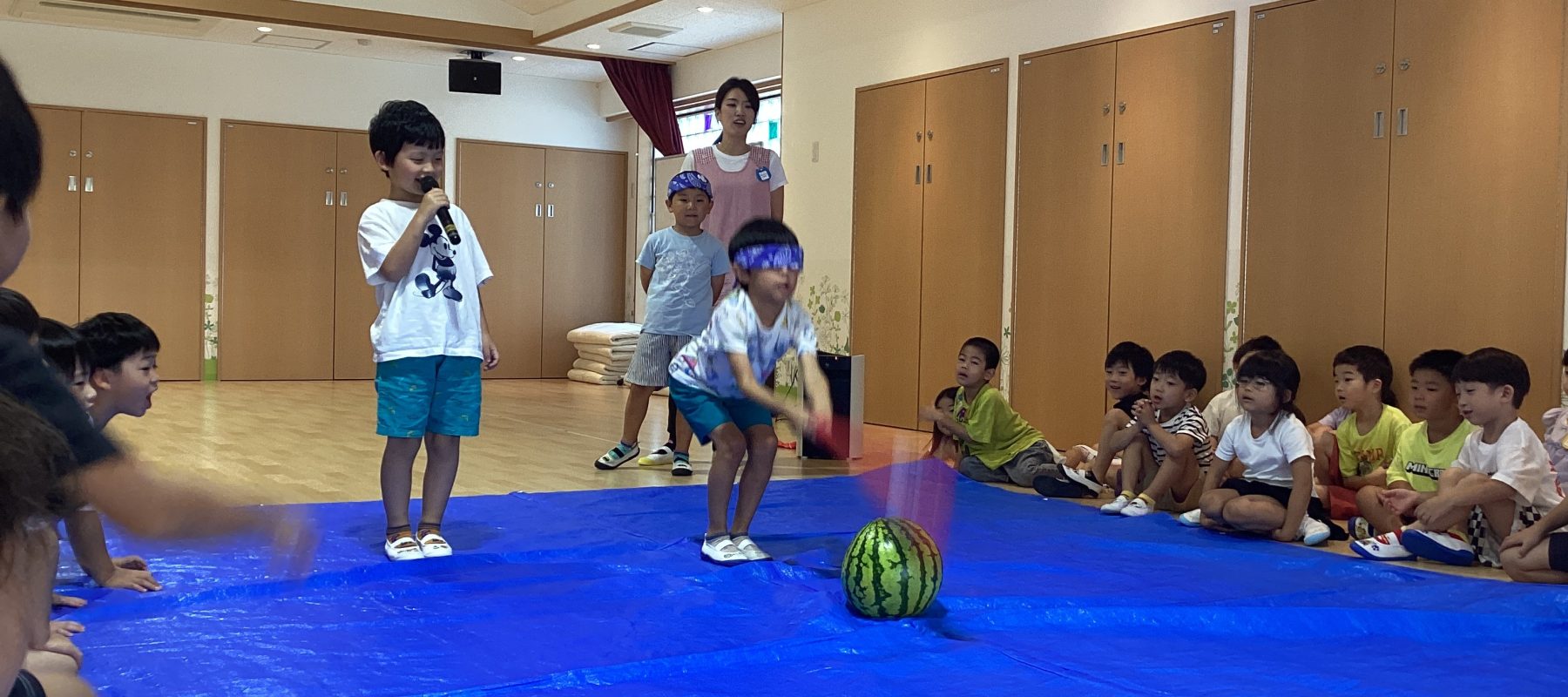 りんご組さんから順番にすいかわりに挑戦。めろん組さんは目隠しをしてお友達が「右、前に3歩」とマイクで教えてくれていました。