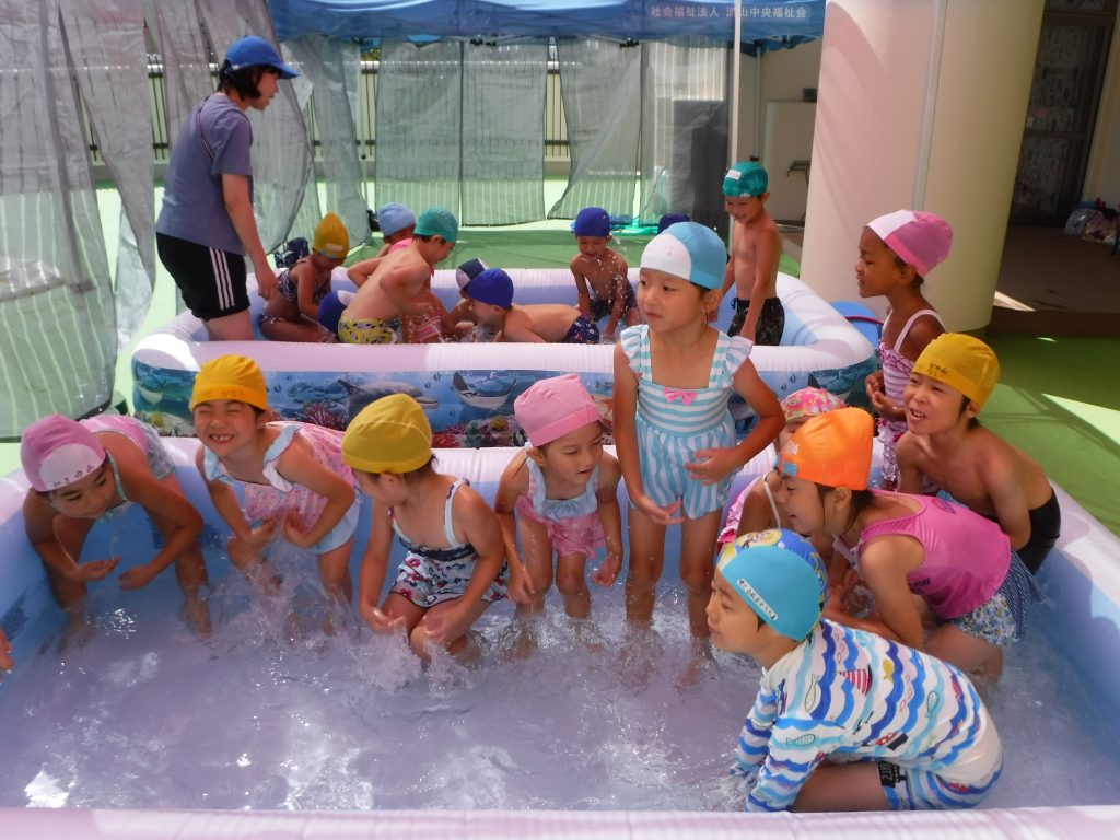 やっとプールに入れると「プールに入れる!」「やったー!」と大喜びの子ども達です。