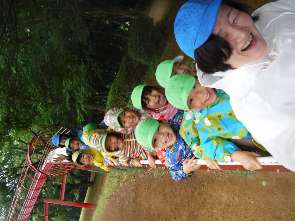 でしたが、そんな雨を吹き飛ばす程子ども達はカッパを着て遊具で沢山遊んでいました。ローラー滑り台もとても速いスピードが出ましたが、怖がることなく友達と一緒に列になって滑っていました。お昼のお弁当は、愛情たっぷり!とっても美味しそうにモリモリと食べていました。帰りはバスに揺られてみんなぐっすり夢の中でした♪