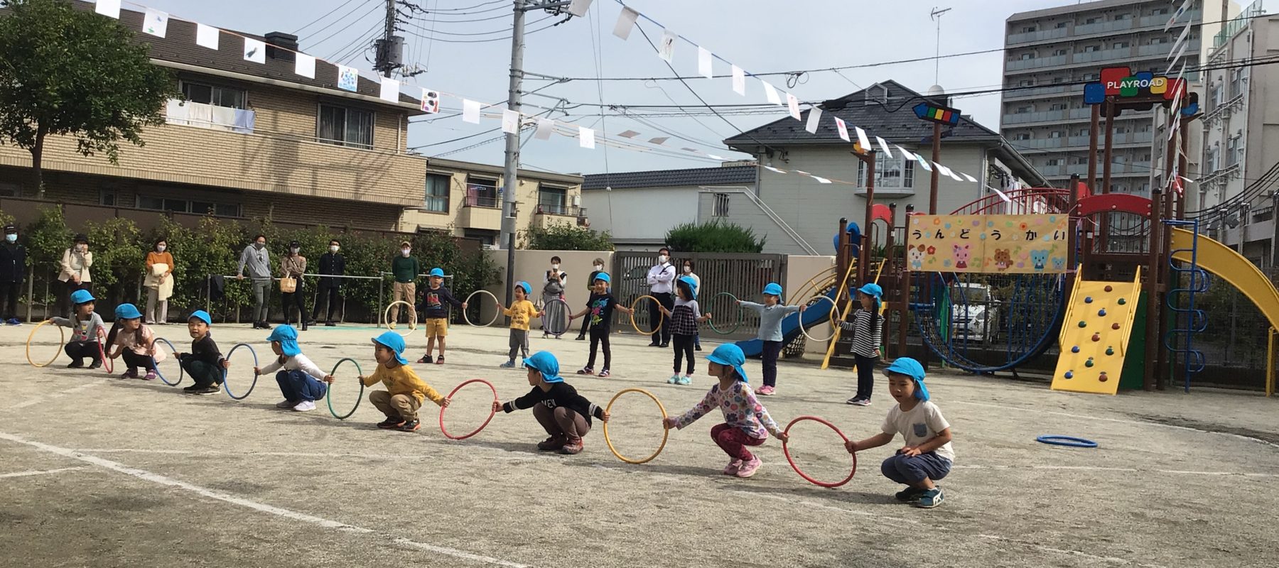 晴れた青空の下、園庭で運動会ごっこを行いました。
