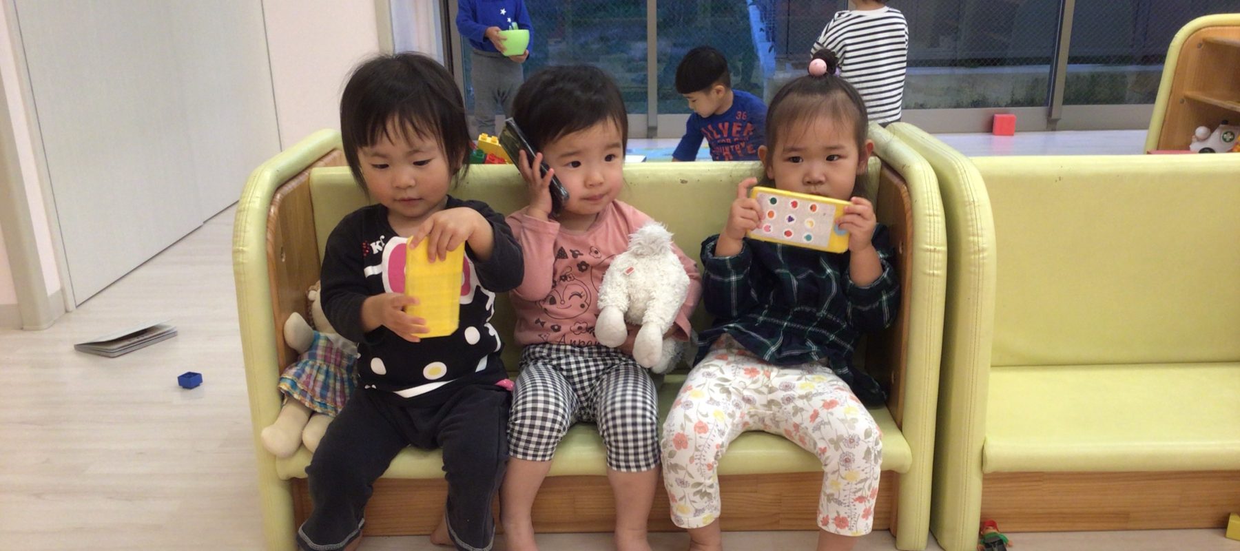 1歳児いちご組では、手作り玩具の携帯電話が大人気!