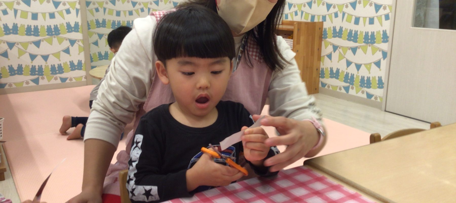2歳児もも組で、初めてはさみを使いました!はさみを見せると目をキラキラさせて興味津々のみんな。先生と一緒に使い方を練習してから一回切りに挑戦しました!小さな手で一生懸命切る姿がとっても可愛らしかったです♪可愛い作品が出来上がってみんな大喜びでしたよ。