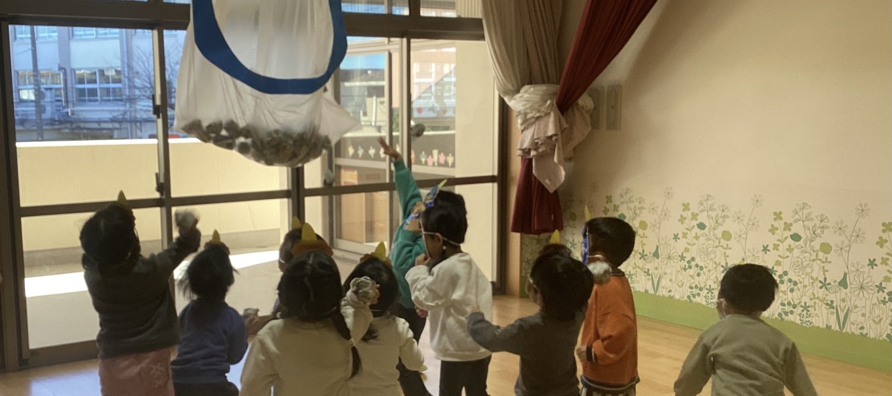心の鬼を退治する為に、鬼の口に向かって『おにはそと!ふくはうち!』とボールを入れました♪