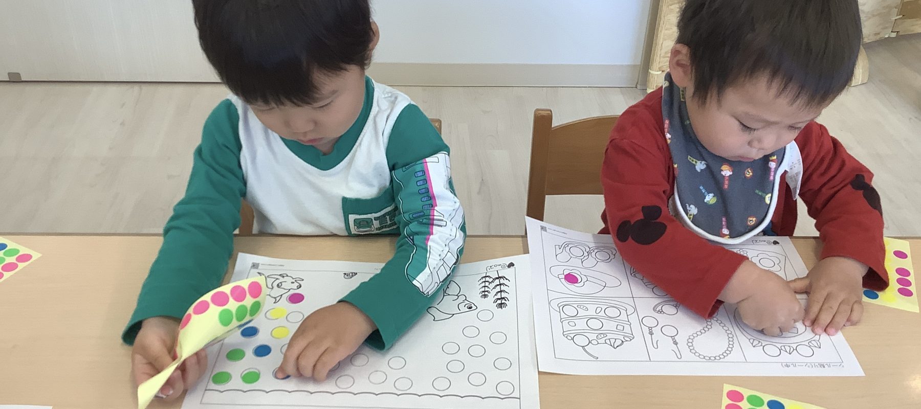 台紙の丸い枠からズレないように真剣な面持ちで貼っている姿が可愛いですね♪