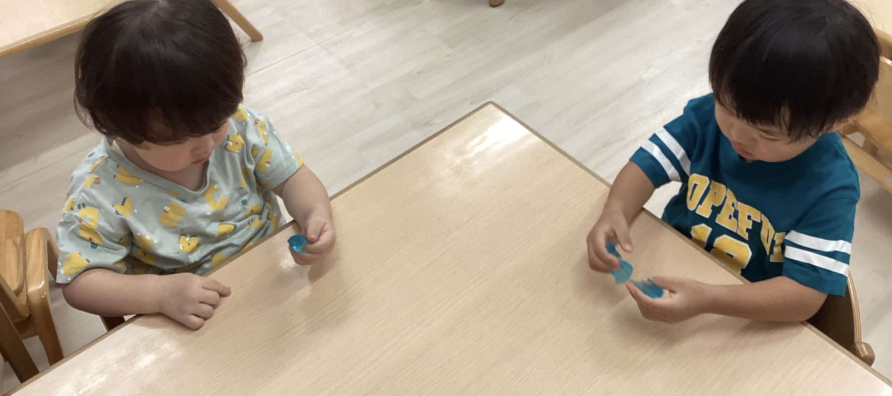 暑い日にたくさん楽しんだ水遊び。水面を叩いて水の感触を楽しんだり、ジョウロやシャベルを使って水が流れる様子を見て遊びました! 先生やお友だちの遊び方を真似する子や、お気に入りのおもちゃで遊び込む子など様々な姿が見られましたよ♪ 水遊びの日はすぐに帽子を被って準備万端!楽しみにしている子も多く、思い切り遊ぶ事ができました☺