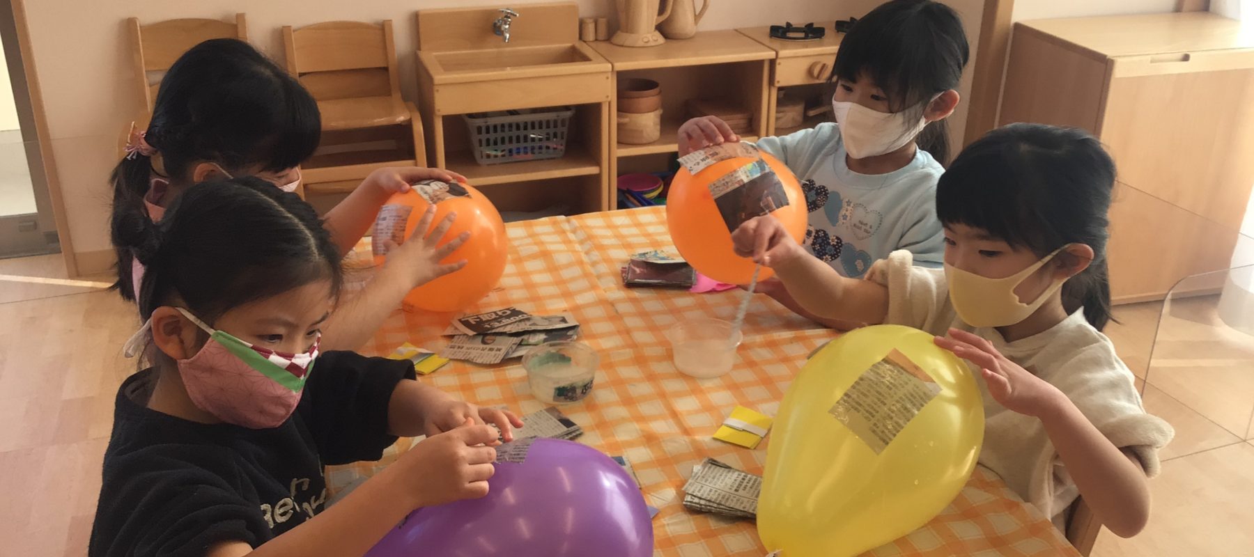 4歳クラスのぶどう組は節分の行事に向けた制作で鬼のお面を作りました。風船に新聞紙や好きな色の折り紙を貼り、顔の土台作りを集中して取り組んでいました!乾いて完成したら風船を割ると被れるほどの大きなお面が出来ました。角や顔のパーツを貼って個性豊かなお面が完成しました♪節分の当日は鬼のお面を被って参加します!