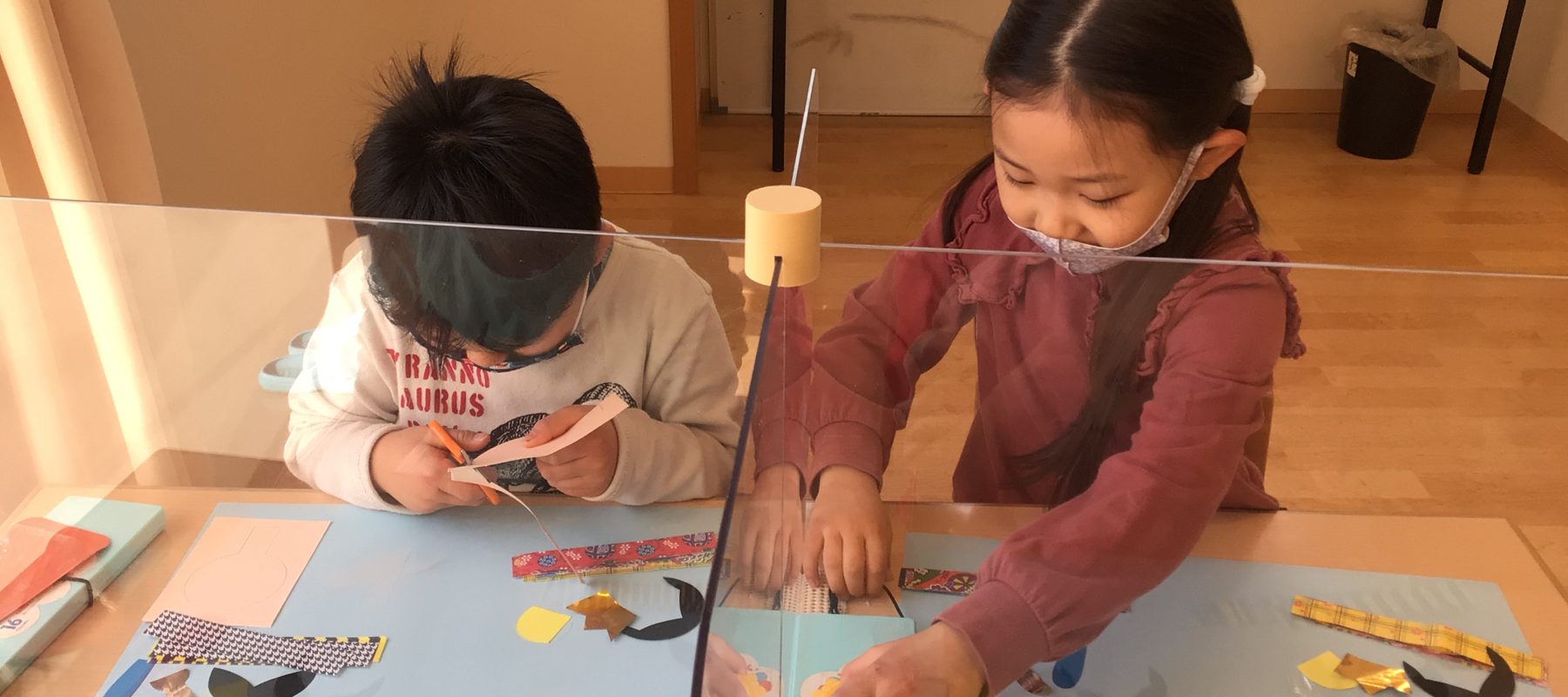 5歳児めろん組は、ひな祭り制作をしました。着物の部分を組み立てるのは難しかったですが、お友だち同士で教え合ったり、自分で先生に聞いてみたりしながら丁寧に作っていました。顔のパーツはクレヨンで描き、金の屏風は紙袋に金色の折り紙を貼って、かわいらしいお内裏様とお雛様が完成しました!お部屋に飾ると「かわいい♡」としばらく眺めていためろん組さんでした♪